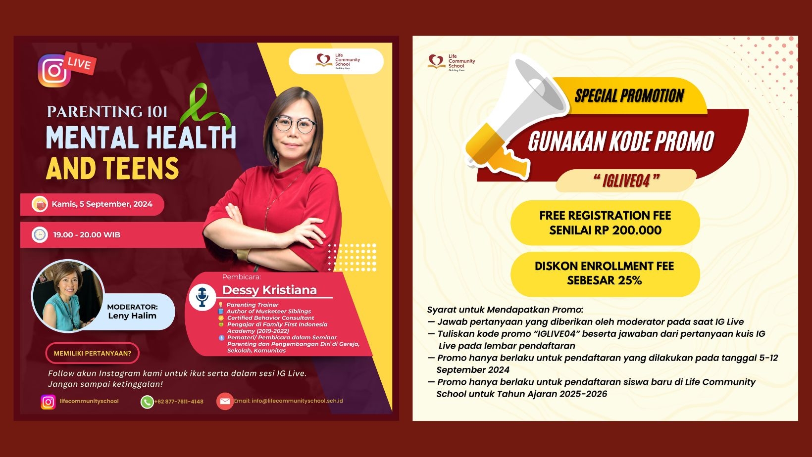 Transform Your Parenting: Key Insights into Teen Mental Health! 03 Oct 2024 Explore the important topic of Mental Health and Teens in our IG Live session hosted by Life Community School. Learn how one in three teenagers in Indonesia faces mental health challenges. Our speaker, Dessy Kristiana, a Parenting Trainer and Author, shares valuable tips for parents on understanding their teens and identifying serious mental health issues. More... |