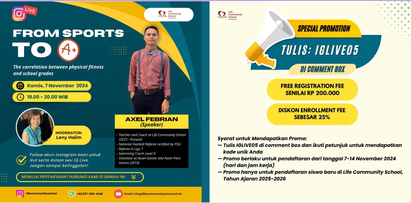 Ajak teman dan keluarga untuk mengikuti sesi ini, karena kita akan menggali lebih dalam bagaimana olahraga dapat mendukung kesuksesan akademik siswa. Sampai bertemu di IG Live tanggal 7 November nanti ya!